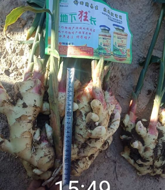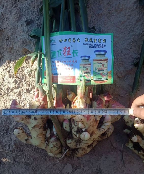 我們的市場人員現(xiàn)場挖姜,將噴施地下狂長的大姜與噴施其他產(chǎn)品的大姜現(xiàn)場測量對比,噴施過地下狂長的大姜姜指頭粗胖、連接點粗,不易破盤,姜盤齊整,并且比噴施其他產(chǎn)品的大姜長10cm,高5cm,對比非常明顯。