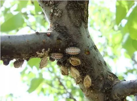 蚧殼蟲以若蟲和成蟲固著刺吸寄主汁液,蟲量特別大,有的完全覆蓋住樹皮,相互重疊成層,形成凸凹不平的灰白色蠟物質(zhì),排滿泄粘液污染樹體呈油漬狀,被害枝條發(fā)育不良,重者整枝或整株枯死,以2-3年生枝條受害重。