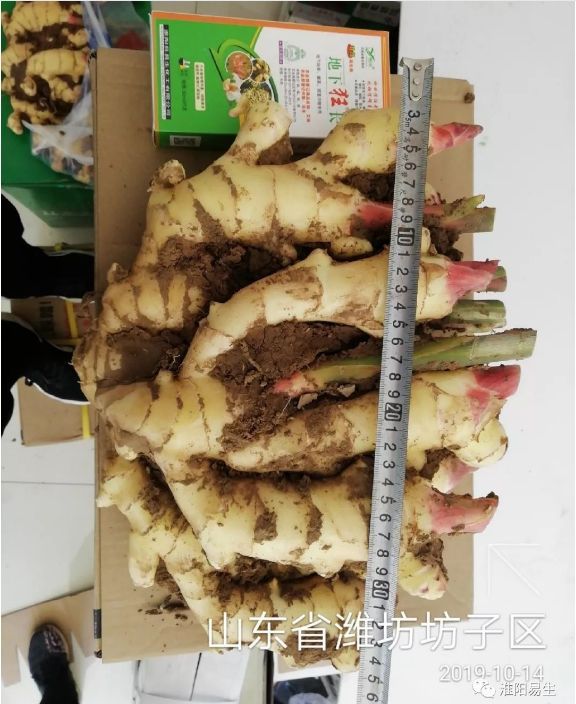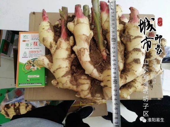 噴施地下狂長的大姜姜面平整,整齊度非常高,姜根粗長,大姜顏色金黃光亮,姜指頭粗大。我們市場人員現(xiàn)場測量,大姜長35cm,寬25cm。這么大的姜真是不多見!